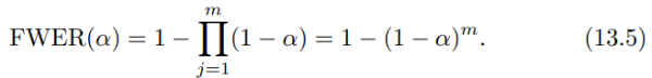 따라서 하나의 귀무가설만 검정하면 FWER(α)=1−(1−α) = α이므로 제1종 오류율과 FWER은 동일하다.